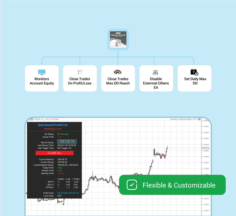 The MeetAlgo Equity Guard EA is your safety net. It automatically tracks your equity, locks in profits, prevents daily and total drawdowns, and protects your account from violations. Whether you're trading manually or using other EAs, this tool ensures you stay within challenge rules—so you can focus on trading, not worrying about limits.